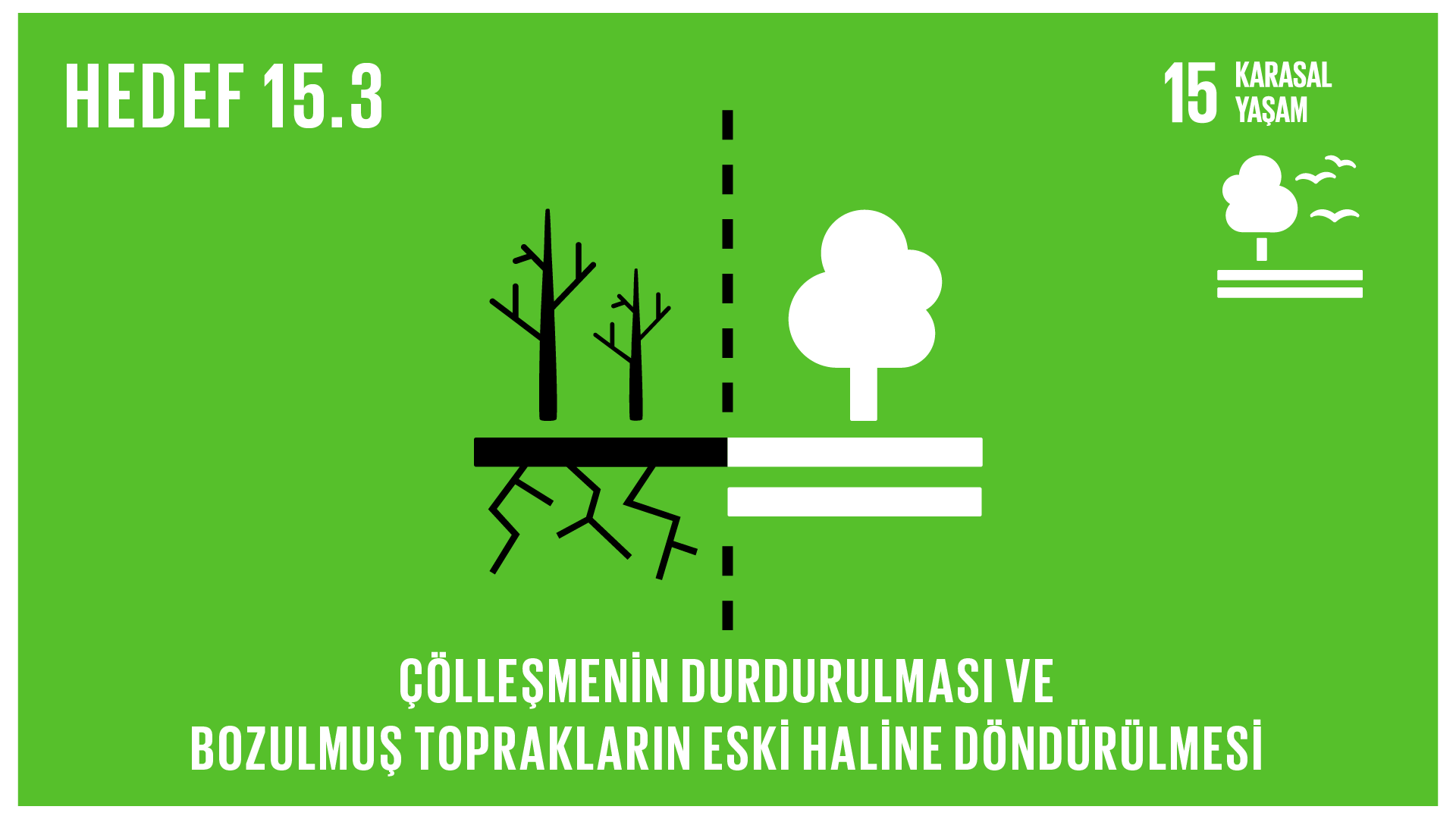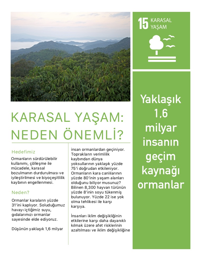 Karasal ekosistemlerin sürdürülebilir kullanımının korunması, geliştirilmesi ve desteklenmesi, ormanların sürdürülebilir yönetimi, çölleşme ile mücadele, karasal bozulmanın durdurulması ve iyileştirilmesi ve biyoçeşitlilik kaybının engellenmesi