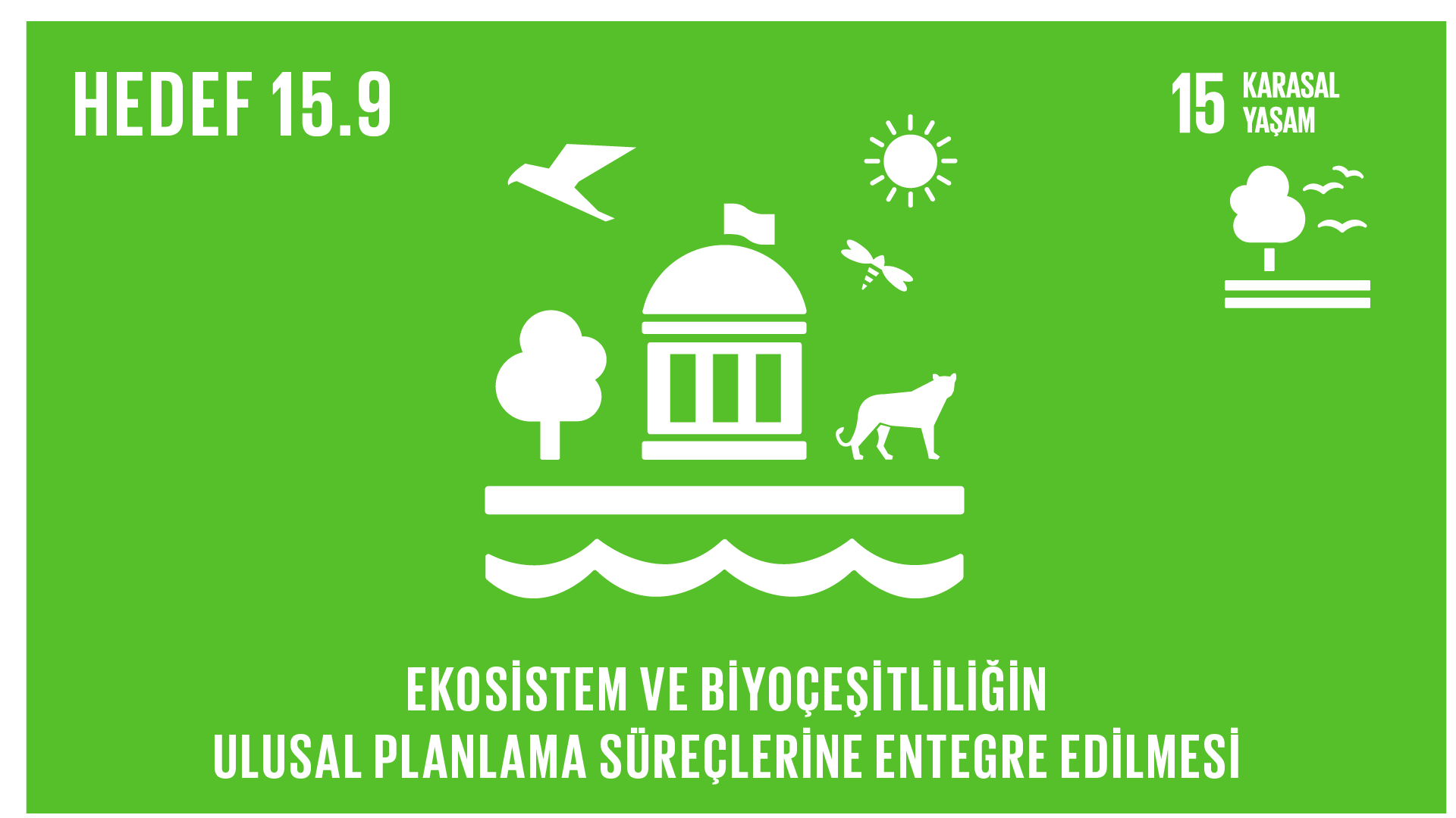 15.9. 2020’ye kadar ekosistem ve biyoçeşitlilik değerlerinin ulusal ve yerel planlamalara, kalkınma süreçlerine, yoksulluğun azaltılmasına ilişkin stratejilere ve raporlara entegre edilmesi15.9.1. 2011-2020 Biyoçeşitlilik Stratejik Planı'nın Aichi Biyoçeşitlilik Hedefi 2 ile uyumlu ulusal hedeflere yönelik ilerleme