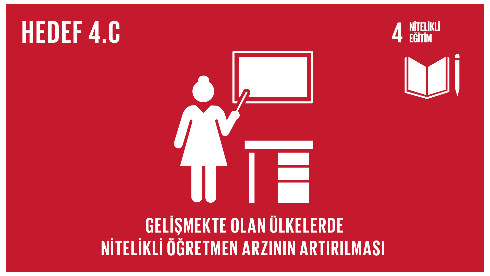 4.c. 2030’a kadar özellikle en az gelişmiş ülkeler ve gelişmekte olan küçük ada devletleri başta olmak üzere gelişmekte olan ülkelerdeki öğretmen eğitimi için uluslararası işbirliğinin sağlanması aracılığıyla nitelikli öğretmen tedarikinin önemli ölçüde artırılması4.c.1. Belirli bir ülkede, (a) okul öncesi; (b) ilkokul; (c) ortaokul; ve (d) lise düzeylerinde geçerli seviyede öğretim için gerekli olan hizmet öncesi veya hizmet içi en az asgari düzeyde düzenlenen öğretmen eğitimi (örneğin pedagojik eğitim) almış öğretmenlerin oranı